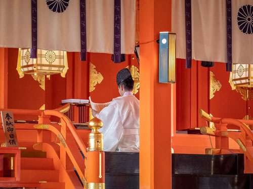 b) Oraciones: recitación de palabras místicas en japonés clásico por parte de los sacerdotes sintoístas.