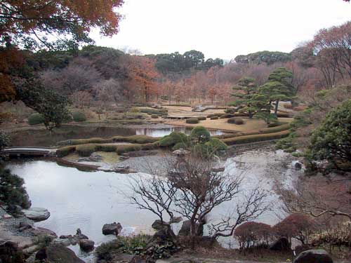 Paisajísticamente se aprecia una pequeña isla de hierba salvaje con plantas nativas del archipiélago; orquídeas, árboles de té, un extenso jardín de rosas, un pequeño bosque de bambú con en torno a trece especies distintas, una pequeña isla de árboles de sakura que cuentan con una treintena de especies y varios edificios importantes: el Toka-gakudo, una sala de conciertos, el Tenshu-dai y el Fujimi-yagura-